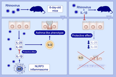 背景:生命早期气喘相关性人鼻病毒(RV)呼吸道感染与哮喘的发展有关。6日龄未成熟小鼠RV感染可导致粘液化生和气道高反应性,这与产生IL-13的2型固有淋巴细胞(ILC2s)的扩张有关,并且依赖于IL-25和IL-33。我们检测了IL-1β对这种哮喘样表型的调节作用。