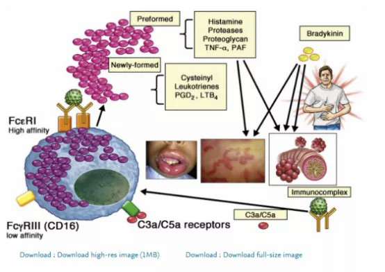 速发型过敏反应的定义是一种严重的、危及生命的、迅速发展的、广泛或全身性的超敏反应。典型的临床症状包括支气管收缩、血管扩张、低血容量,可导致呼吸功能不全、休克和死亡。当反应是由免疫机制(IgE、IgG和补体相关的免疫复合物)介导时,被称为过敏反应。根据IgE的参与情况,反应又可分为IgE介导反应和非IgE介导反应。典型的临床症状包括支气管收缩、血管扩张和低血容量(单独或联合使用),可导致呼吸功能不全、休克和死亡。儿童过敏反应的最主要原因是食物,而成人过敏反应的主要原因是药物,特别是抗生素、神经肌肉阻断剂(NMBA)、非甾体类抗炎药(NSAID)、造影剂和生物制剂。由IgE抗体介导的过敏反应的典型例子是花生诱导的食物过敏反应,它可被称为IgE介导的过敏反应。这种过敏反应通常被认为是由于T细胞识别抗原并启动Th2型反应后,B细胞产生IgE抗体。