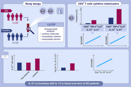 背景:流式细胞术是一种广为接受的免疫分析方法;然而,它的价值受限于可以同时分析的标记物的数量。质谱流式细胞术/CyTOF提供大规模免疫表征整合成大量参数。虽然在特应性皮炎(AD)中报告了部分血液表型,但对利用新的靶向治疗至关重要的患者综合分析尚不可用。IL-21可能与炎症性皮肤病有关,但其在AD中的作用尚未确定。