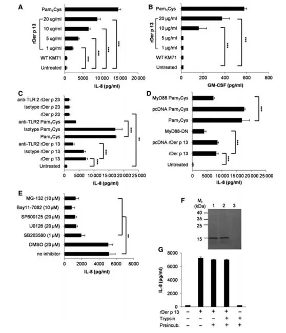 ① 屋尘螨(HDM)变应原Der p 13可能是一种脂结合蛋白,能够激活启动变应反应的关键先天信号通路;② 纯化的rDer p 13通过质谱、圆二色性、基于荧光的脂质结合分析和硅结构预测等方法来进行表征分析;③ 采用ELISA、嗜碱性粒细胞脱颗粒试验和体外气道上皮细胞活化试验检测Der p 13的IgE结合活性和致敏活性;④ 荧光脂质结合试验证实,该蛋白质对配体具有高度选择性,并且它与脂肪酸结合具有典型的脂质转运蛋白解离常数;⑤ Der p 13 通过其脂质结合能力,并由TLR2激活,然后在HDM过敏反应中起作用。