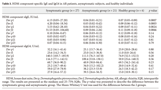 Conclusions: There are differences in SPT, serum-specific IgE to Der p, component allergen Der p1 and Der p2 level and BAT between AR patients and asymptomatic subjects sensitized to HDM. IgG4 alone cannot differentiate asymptomatic individuals from AR patients.