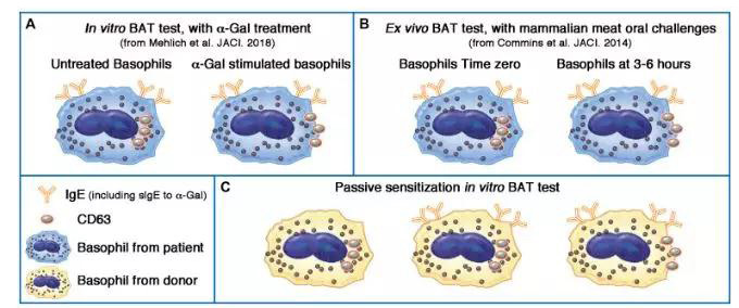尽管嗜碱性细胞活化试验有高AUC,不太可能有一个具有高灵敏度和高特异性的单一的临界点来预测哪些对α-半乳糖敏感的受试者是临床过敏的。例如,0.227 ng / mL的刺激浓度是猪肾BAT的最佳条件之一(AUC = 0.95), α-半乳糖综合症受试者的阳性率是57%,敏感组中的阳性率为0 (用15%嗜碱性细胞阳性作为临界点)。相比之下,商业明胶制剂皮内皮肤试验结果(4% Gelafundin [B. Braun; Melsungen AG, Melsungen, Germany]) :93%的α-Gal综合症受试者阳性,但在无症状的敏感者中只有13%的阳性率。因此,皮内皮肤试验比BAT有更高的敏感性,但只是在特异性上略有损失。血清sIgE检测与皮内检测结果相似,通过计算α-半乳糖特异性IgE占总IgE的百分比,用3%α-半乳糖特异性IgE作为临界值(90% vs 17%),尽管如此,Mehlich等人工作的一个真正的优点是在一个定义良好的患者群体中对不同的测试方式进行面对面的比较。需要进一步考虑的是,有关对α-半乳糖的IgE敏感性可能存在比速发型过敏反应还要严重的健康风险的可能性。这源自一个最近的报告,它证实了α-半乳糖特异性IgE与冠状动脉疾病之间的相关性。尽管研究对象很少,目前也没有机理研究来支持这一观察结果,但这种联系在生物学上是可信的。解释两者之间关联性的工作模型显示,慢性摄入那些敏感的α-半乳糖可能导致持久的冠状动脉壁的慢性炎症。虽然目前数据还不足以提出建议来改变临床实践,这项研究使我们在给α-半乳糖敏感患者饮食建议时引起注意,尤其是那些已经具有心脏病危险因素的患者。超出了BAT可能的临床价值,或许当前报告与建议的最大贡献是建议对α-半乳糖生物学的关注。以前,它提出了肠道微生物群,肠道屏障功能,或全身代谢的差异可以解释为什么一些α-半乳糖敏感受试者对哺乳动物产品有临床反应而另一些人不会。尽管目前的工作并不排除这些可能性,有趣的是,α-Gal综合症患者的类胰蛋白酶水平显著升高,而嗜碱细胞活化程度处于基线。这表明反应者和耐受者之间的差异可能是由于过敏效应细胞(如肥大细胞和嗜碱性细胞)的固有活化程度的差异,这与最近卡特等的报告相一致。还有一点重要的是,不能低估特异性IgE滴度和亲和性所起的作用。总之,在本研究队列中,α-半乳糖综合症患者血清检测的滴度明显升高。用被动致敏技术进行嗜碱性细胞活化试验(BAT)可能是另一条途径。需要再次提醒的是,体外嗜碱性细胞活化试验(BAT)研究已经提供了重要的机理性证据,支持临床观察到的3-6小时的特征性延后反应。