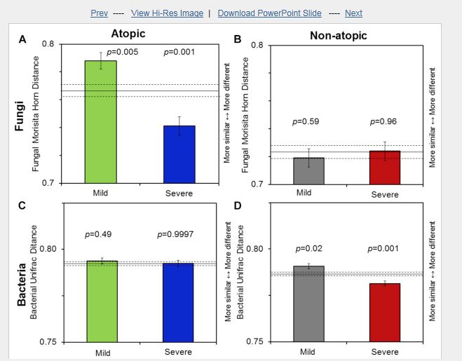 ①儿童过敏性和非过敏性哮喘的严重程度可能受到微生物暴露的影响②我们试图研究家庭微生物暴露与儿童哮喘严重程度之间的关系。③参与者(n = 196)是从康涅狄格州和马萨诸塞州的一组哮喘儿童中挑选出来的。儿童按哮喘严重程度(轻度无症状或有最小症状需药物治疗或中度至重度持续性)和特应性状态(由血清IgE水平决定)进行分组。采用下一代DNA测序和定量PCR法测定室内粉尘中的微生物群落结构和浓度。利用Logistic回归研究哮喘严重程度与暴露指标之间的关系,包括丰度、微生物种类鉴定和量化、群落组成、总真菌和细菌浓度。④在所有儿童中,除了使用距离比较t检验的微生物群落组成外,还使用logistic回归分析,结果显示哮喘严重程度的增加与总变应原性真菌种类浓度的增加、真菌总浓度的增加和细菌丰度的增加显著相关。特应性儿童哮喘的严重程度与真菌群落组成有关(P = .001)。通过logistic回归分析,非变应性患儿哮喘的严重程度与总真菌浓度相关(优势比,2.40;95% CI, 1.06-5.44)。真菌属Volutella与特应性儿童的哮喘加重有关(P = 0.0001, q = 0.04)。酵母属Kondoa可能具有保护作用;隐球酵母也可能影响哮喘的严重程度。⑤在这一组儿童中,哮喘的严重程度与微生物暴露程度有关,并且根据周围环境的不同而有不同的关联。