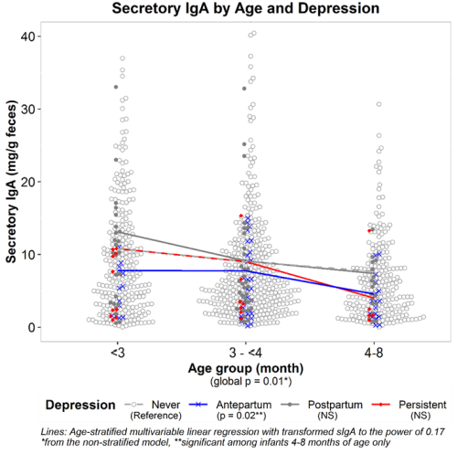 结果:在产前和持续抑郁的母亲中,婴儿粪便中的sIgA浓度非常低(6%女性和2%女性)。 与粪便取样时的母乳喂养状况、婴儿抗生素暴露或其他协变量无关,孕妇产前抑郁症状与婴儿平均sIgA浓度降低(β=-0.07,p<0.01)相关。sIgA的降低会对较大的婴儿(4至8个月)产生很大的影响—无论是否母乳喂养。没有发现婴儿sIgA降低与产后抑郁症状(7%女性)或任何可察觉的压力情况相关。