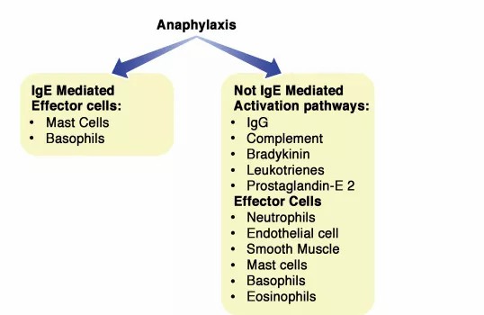 IgE介导通路由过敏原启动,当过敏原与特异性IgE抗体结合时,导致肥大细胞(MC)和嗜碱性细胞上的高亲和性IgE受体(FcεRI)发生交联并启动信号级联,释放包括组胺在内的介质,以及预形成的细胞因子和蛋白酶,以及合成和分泌额外的细胞因子和脂质介质,如血小板激活因子(PAF)、白三烯和前列腺素。典型的过敏反应途径是适应性免疫的一个例子。对过敏原过敏反应的临床诊断是基于这种IgE范式的。当使用免疫调节治疗(如免疫疗法或抗IgE)时,对特定过敏原的IgE水平高与疾病严重或持续时间长有关,也与治疗失败有关。然而,有相当一部分经历过过敏反应的患者并没有出现IgE依赖性免疫激活的任何证据。在这些患者中,没有迹象表明IgE介导的MC或嗜碱性粒细胞激活,如皮肤试验阳性结果、存在过敏原特异性IgE或组胺升高。在一些患者中,根本没有MC激活的证据,例如,他们有正常的胰蛋白酶。所有这些数据表明存在其他潜在的机制。