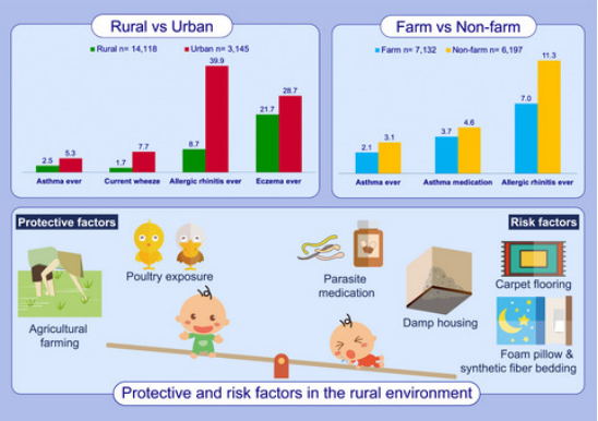 Conclusion: We confirmed that the prevalence of asthma and atopic disorders was significantly lower in rural children when compared with their urban peers. Exposure to poultry and agricultural farming are the most important factors associated with asthma protection in the rural area.