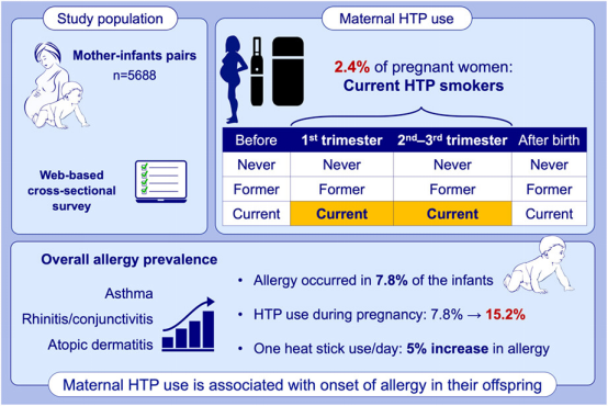 Results: In total, 2.4% women smoked HTPs during pregnancy. Allergy occurred in 7.8% of the infants. The prevalence of allergy increased among the offspring of current HTP smokers during pregnancy at 15.2% (PR = 1.98, 95% CI 1.28–3.05); this association was the most pronounced during the first trimester but attenuated before pregnancy and postpartum. Dose–response associations were observed, for example a one-unit increase in daily maternal HTP use during pregnancy was associated with a 5% increase in allergy onset. Sub-group analyses excluding cigarette smokers during pregnancy and sensitivity analyses using the International Study of Asthma and Allergies in Childhood questionnaire showed a similar pattern.